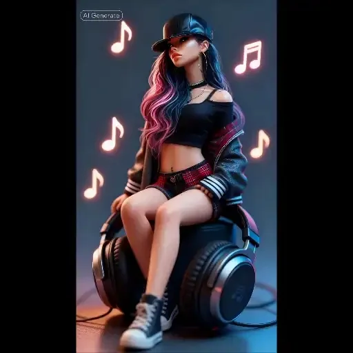 Uma jovem mulher sentada em um par de alto-falantes, usando um boné, óculos de sol, um cropped preto e uma jaqueta. Ela tem cabelos longos com mechas rosa. Há notas musicais ao redor dela.