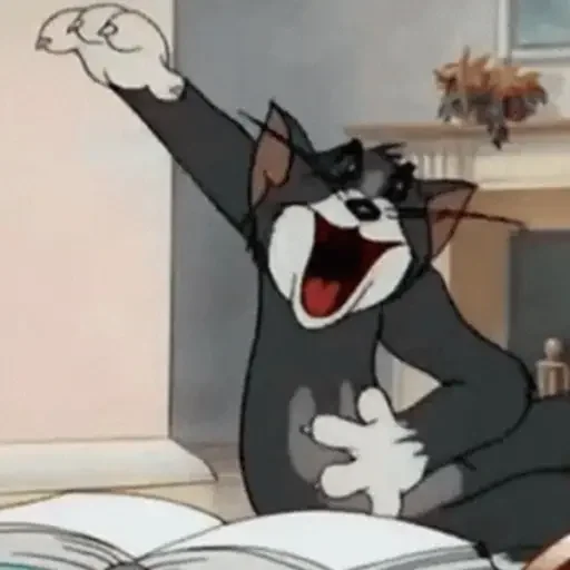 Gato cartoon com expressão de surpresa ou alegria, braço levantado e boca aberta, sentado ao lado de um livro.