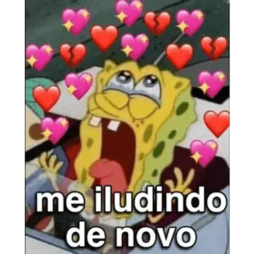 EsponjaBob com expressão de surpresa e amor, rodeado de corações coloridos. Ele está com a boca aberta e olhos arregalados, com texto 'me iludindo de novo' sobreposto.