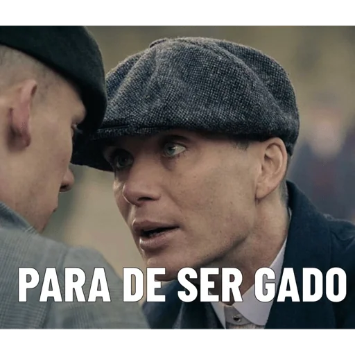 Dois homens se olhando, um deles usando um chapéu de feltro cinza e um casaco preto. O texto 'PARA DE SER GADO' aparece em branco na parte inferior.
