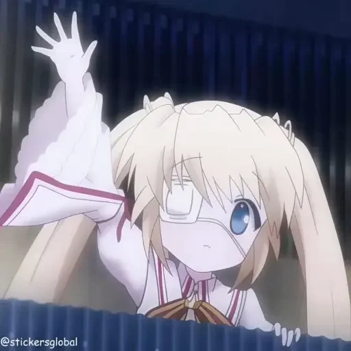 Garota de anime com cabelo loiro e olho azul, vestindo uniforme branco com detalhes rosa, acenando com a mão.