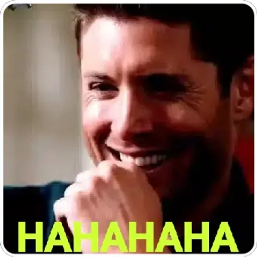 Um homem sorrindo com a mão no queixo e a legenda 'HAHAHAHA' em amarelo.