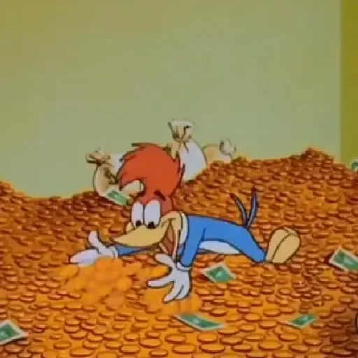 Personagem de desenho animado, provavelmente o Woody Woodpecker, deitado em uma grande pilha de moedas de ouro e dinheiro, com expressão surpresa.