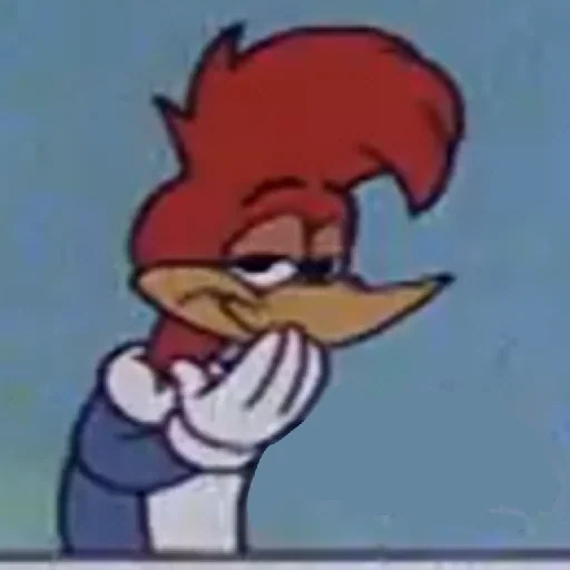 Um pássaro cartoon com penas vermelhas e bico amarelo, vestindo uma camisa azul e branca, com expressão de surpresa ou preocupação.