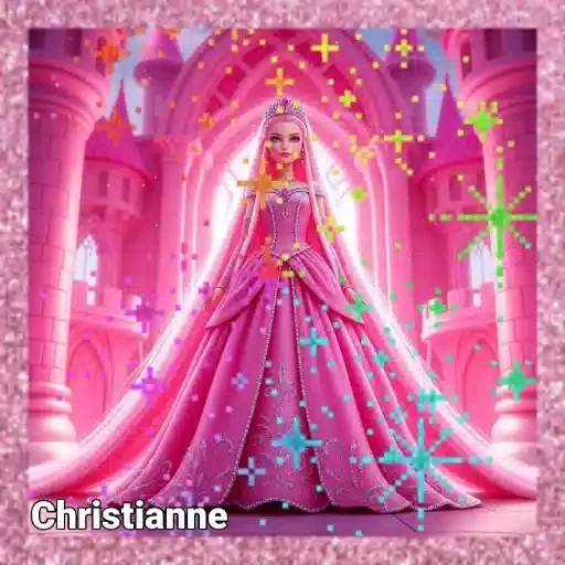 Uma princesa loira com vestido rosa e véu, em um cenário de castelo rosa com estrelas coloridas. O nome 'Christianne' aparece no canto inferior esquerdo.