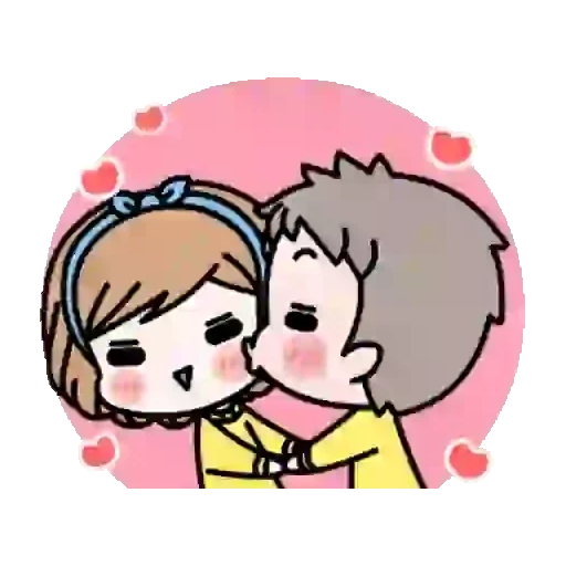 Um casal de anime, um homem beijando a bochecha de uma mulher com um fundo rosa e corações. A mulher tem um acessório azul no cabelo e a face rosada.
