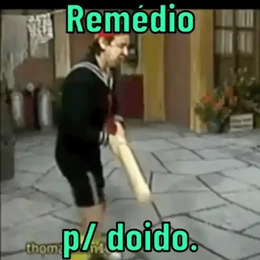Uma mulher de cabelos castanhos, vestida de preto e com uma faixa vermelha na cabeça, segura um taco de beisebol e parece estar em uma varanda ou pátio. A imagem tem o texto "Remédio p/ doido."