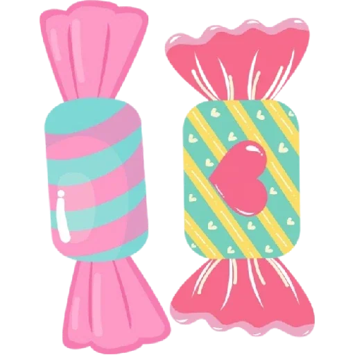 Duas balas coloridas, uma com listras rosa e azul e a outra com listras amarela e azul e um coração rosa no centro.