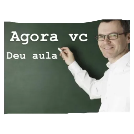 Um homem de óculos e camisa branca escrevendo em um quadro negro com giz, com o texto 'Agora vc Deu aula'.