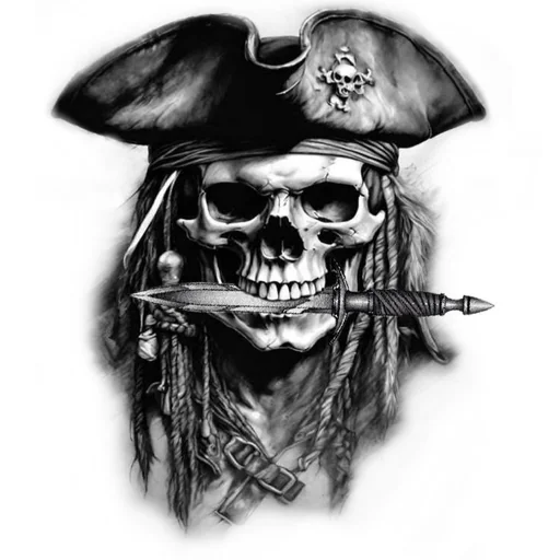 Crânio de pirata com chapéu e faixa, cercado por chamas e desenhos intricados em preto e branco.