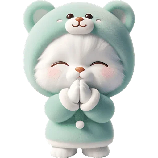 Um ursinho fofinho com pelagem branca e um casaco verde claro, com as mãos juntas em frente ao rosto e olhos fechados.