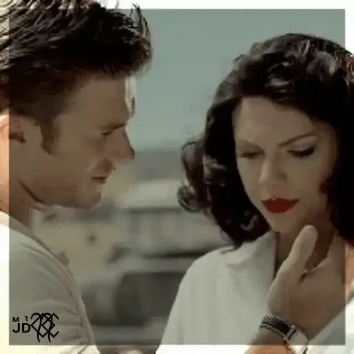 Um casal se olhando, com o homem à esquerda e a mulher à direita, ambos vestindo branco. A mulher tem a mão perto do rosto e parece pensativa.