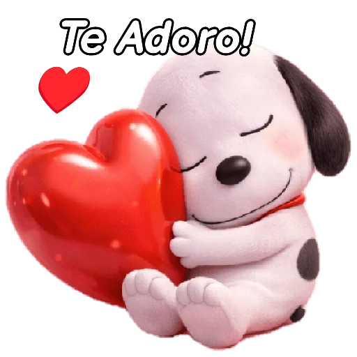 Um cachorro Snoopy abraçando um coração vermelho gigante, com a expressão de amor. O texto 'Te Adoro!' aparece acima.