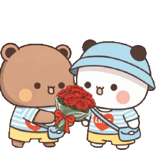 Dois personagens de desenho animado, um urso e outro com cara de neve, se apresentam com um buquê de rosas vermelhas. Eles estão vestidos com camisas listradas e shorts amarelos.