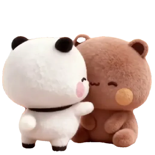 Um ursinho de pelúcia marrom e um animal de pelúcia branco com orelhas pretas se abraçando. O animal branco tem uma bochecha rosa e parece sorrir.