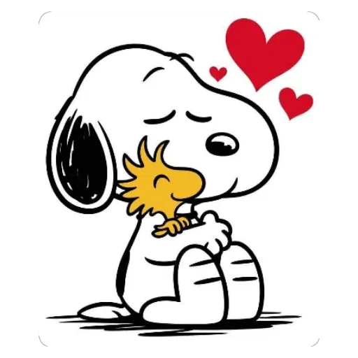 Snoopy e Woodstock sentados juntos, com Snoopy tendo um pensamento romântico, indicado por corações vermelhos acima de sua cabeça.