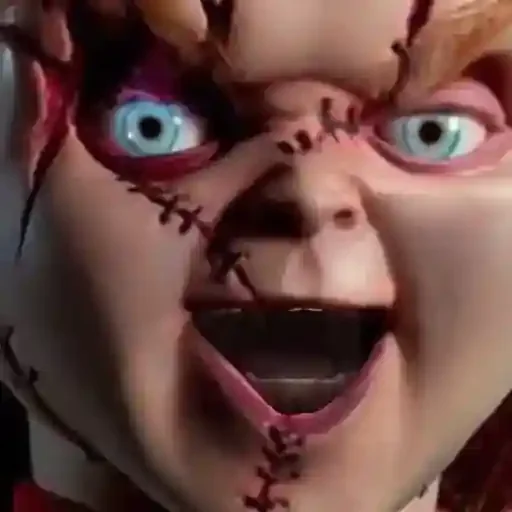 Rosto de Chucky, o boneco assassino, com olhos azuis e costuras no rosto, parecendo assustado ou surpreso.