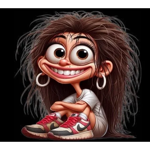 Uma menina cartoon com cabelo castanho desgrenhado, olhos grandes e um sorriso largo, usando um colar e um casaco branco, com sapatos vermelhos.