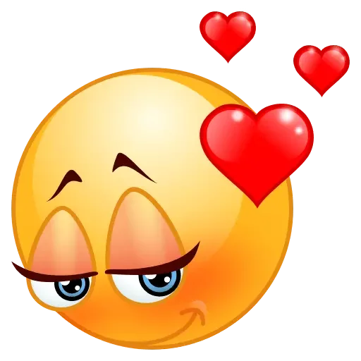 Emoji amarelo com expressão de amor, bochechas rosadas e três corações vermelhos.