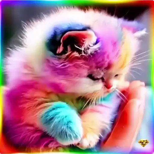 Gatito fofo com pelagem colorida, sendo segurado por uma mão. O gato tem uma expressão fofa e as cores são vibrantes.