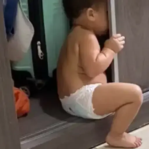 Um bebê deitado de lado, usando fralda, encostado na parede com as mãos fechadas.