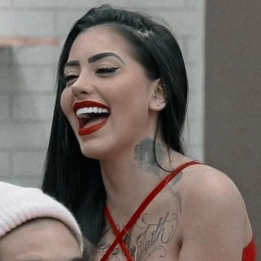 Mulher com cabelo preto e maquiagem colorida ri com a boca aberta, mostrando os dentes. Ela tem uma tatuagem no pescoço e veste uma camisola vermelha.