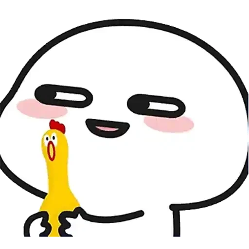 Um desenho de um personagem com cara de alegria e um frango amarelo na frente, com um chapéu vermelho. O personagem tem olhos fechados e bochechas rosadas.