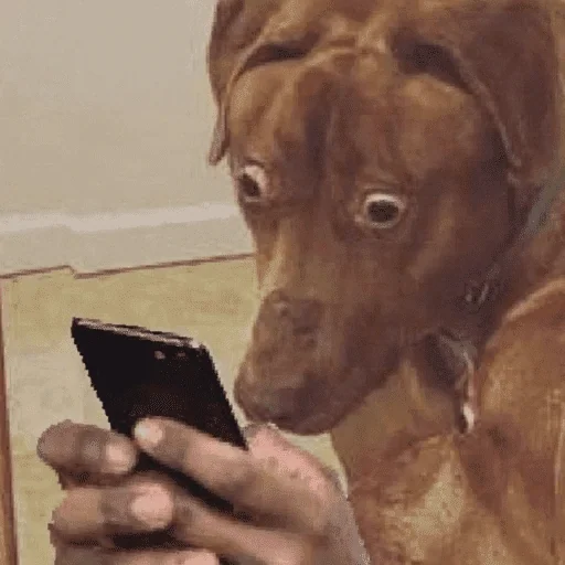 Um cachorro marrom olhando para um celular com uma expressão surpresa, com uma mão humana segurando o aparelho.