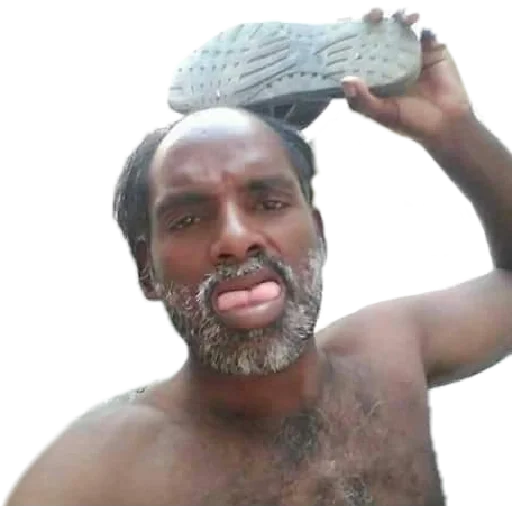 Homem moreno nu com um sapato cinza na cabeça, parecendo confuso ou surpreso.
