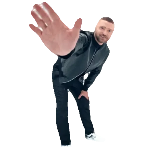 Homem com jaqueta preta e calça preta fazendo um gesto de mão como se estivesse dizendo 'não' ou 'parar', com um sorriso leve no rosto.