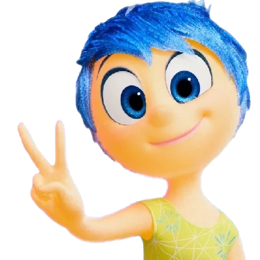 Personagem de filme de animação com cabelo azul e olhos azuis, fazendo um gesto de paz com a mão.