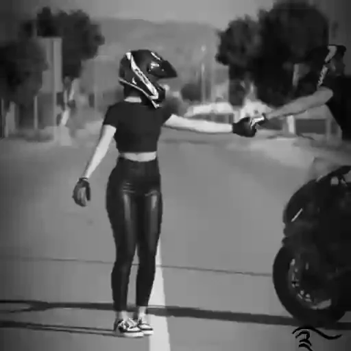 Mulher de shortinho preto e bandana na cabeça estendendo a mão para alguém em uma rua, ao lado de uma moto.