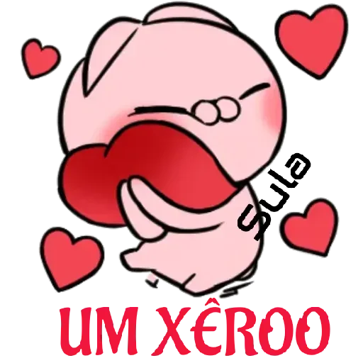 Um personagem de desenho animado rosa com expressão de amor, segurando um coração vermelho grande, rodeado de corações vermelhos menores. Abaixo dele, está escrito 'UM XÉROO' em vermelho.