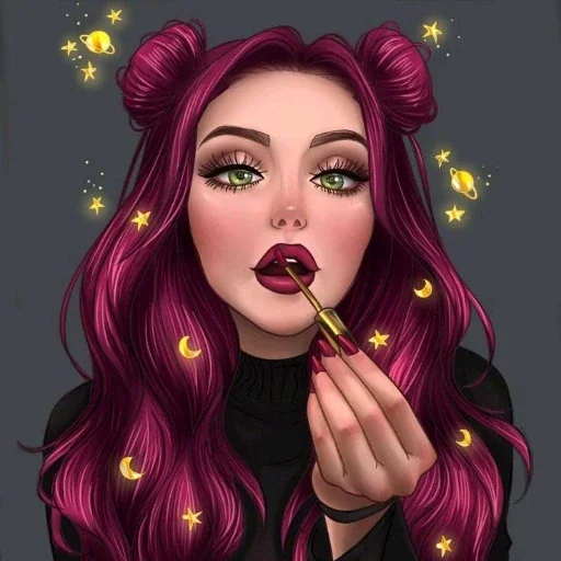 Uma mulher com cabelo rosa e olhos verdes aplicando batom vermelho enquanto é rodeada por estrelas e luas. Ela tem uma maquiagem elaborada e os cabelos ondulados.
