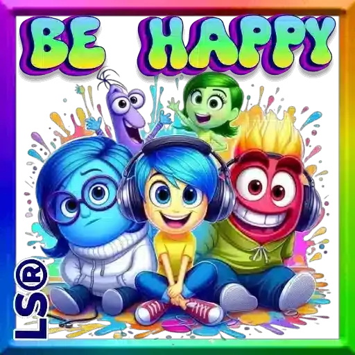 Personagens coloridos de um filme de animação sentados juntos, usando fones de ouvido, com o texto 'BE HAPPY' acima deles. O fundo tem um efeito de respingos de tinta.