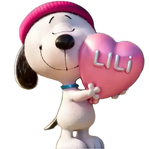 Snoopy de olhos fechados e sorriso no rosto, usando um gorro rosa, abraçando um coração rosa com o nome 'LILI' escrito.