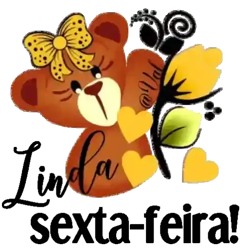 Um ursinho marrom com um laço amarelo no cabelo e um sorriso, ao lado de uma flor e corações amarelos. O texto 'Linda sexta-feira!' está escrito abaixo.