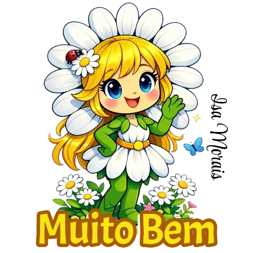 Uma menina de anime com cabelo loiro e olhos azuis, vestida com um traje verde e uma saia de flor de margarina, com a frase 'Muito Bem' embaixo.