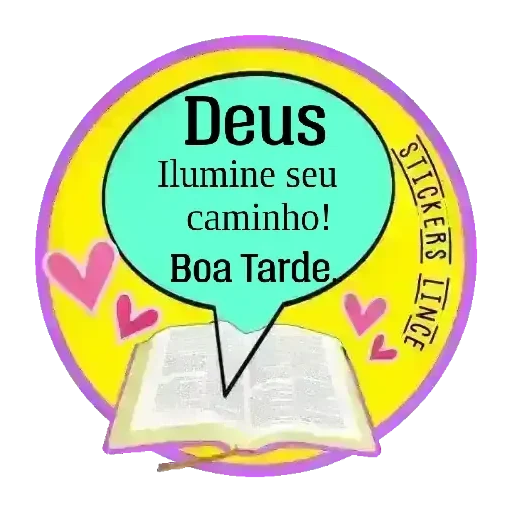 Uma figurinha com um livro aberto e um discurso em uma bolha dizendo 'Deus Ilumine seu caminho! Boa Tarde' em um fundo amarelo com corações rosa.