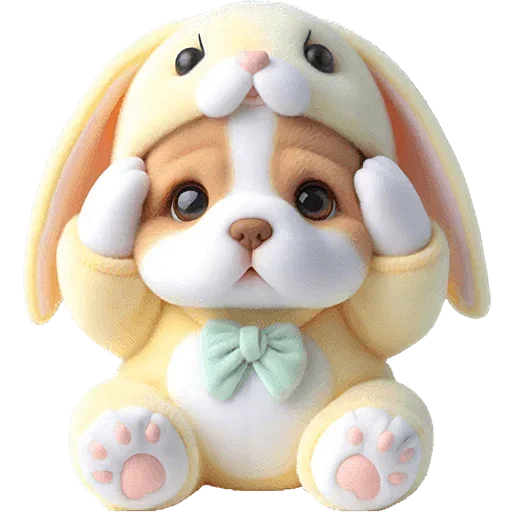Um cachorro vestindo uma fantasia de coelho amarelo, com uma expressão triste e as mãos nas bochechas.