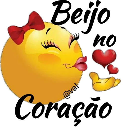 Um emoji de rosto de menina com laço vermelho no cabelo, olhos fechados e beijinho no coração, com texto 'Beijo no Coração' e dois corações vermelhos.