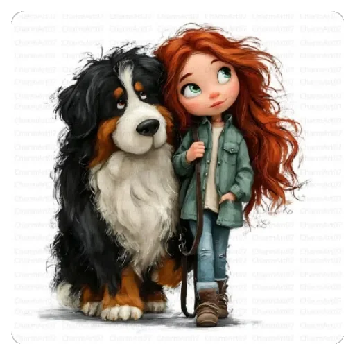 Uma menina com cabelos vermelhos ao lado de um cachorro grande e fofo. O cachorro tem pelagem preta, branca e marrom.