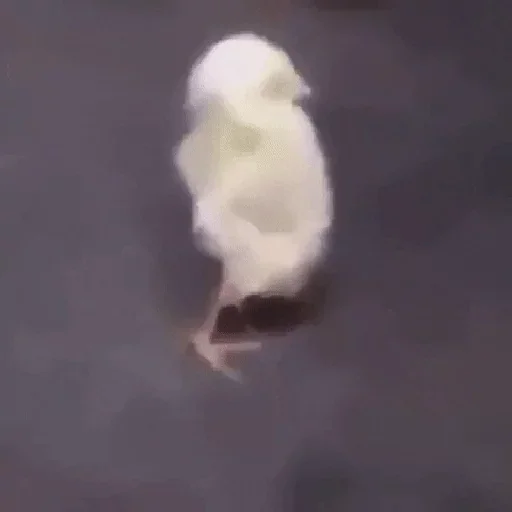 Um filhote de galinha branco e fofo em pé sobre uma superfície cinza.