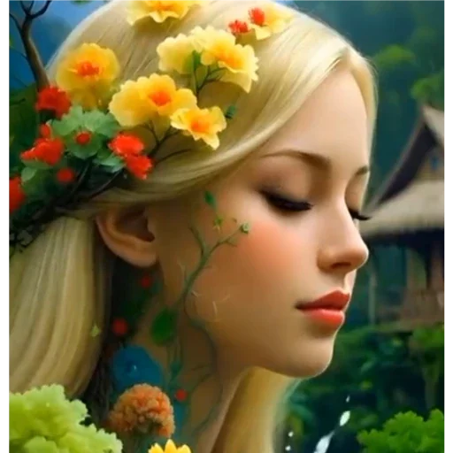 Rosto de uma mulher loira com flores amarelas e vermelhas no cabelo, olhos fechados e uma expressão serena. Ela está rodeada de folhagem e flores.