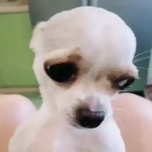 Um cachorro Chihuahua branco com olhos grandes e pretos, parecendo triste ou surpreso.