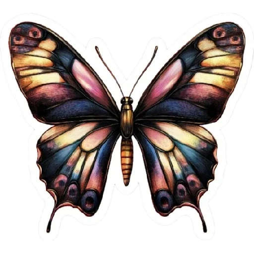 Borboleta colorida com asas abertas, exibindo tons de rosa, amarelo, azul e laranja.