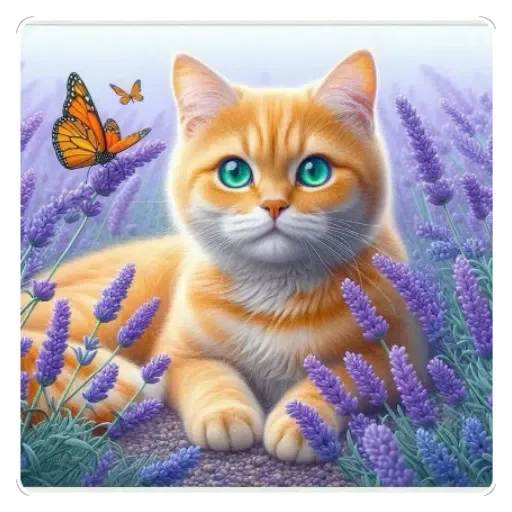 Gato laranja deitado em meio a flores de lavanda com borboletas laranjas ao fundo.
