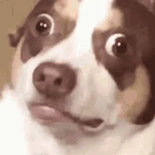 Cachorro com expressão surpresa, olhos arregalados e focados para frente, com focinho e pelagem castanhos e brancos.