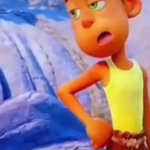 Personagem de anime com expressão surpresa, vestindo uma camiseta amarela, com uma cachoeira ao fundo.