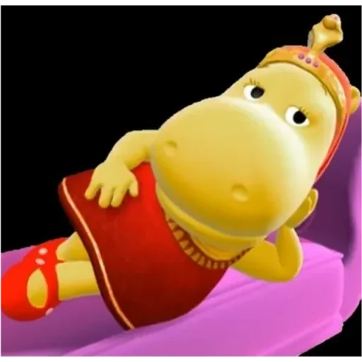 Um hipopótamo amarelo usando uma roupa vermelha e um chapéu, deitado em uma cadeira rosa.